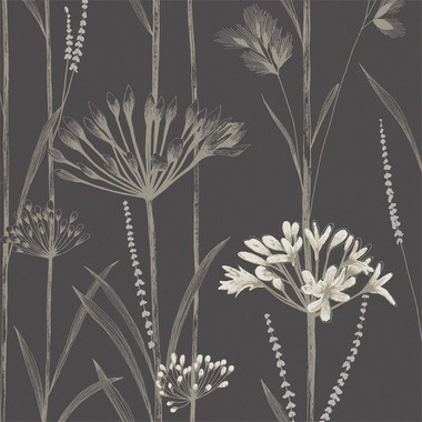 110556 Gardinum wallpaper from the Colour collection by Harlequin features an elegant design of trailing long-stemed seedheads and grasses enhanced with subtle metallic hints and set against a plain background, shown here in shades of Charcoal, Flint and Gilver.