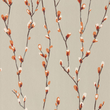The 111470 Salice wallpaper from Harlequin's Idyllic collection offers an abstract, painterly depiction of pussy willow sprays. This artistic design is also available as a fabric under the same name, allowing for cohesive interior decoration. Shown here in Tangerine and Gilver.