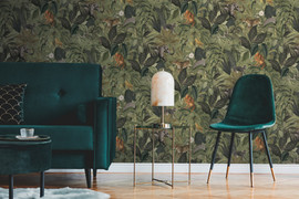 Jungle animals peek out from a dramatic tropical print in 38724-2 wallpaper from the Pint Walls collection by AS Creation. Featuring Leopards, Elephants, Monkeys and more, 38724-2 wallpaper is an on trend tropical design certain to add a quirky feature to any room of the home, shown here in Green and Yellow.