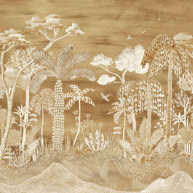 The 76431936 Nosara Wall Panel from Casamance's Panoramas 3 collection transports you to the lush landscapes of Costa Rica, where golden light filters through the silhouettes of trees and intricate, ornamental foliage. Inspired by the verdant paradise near the ocean, this wall panel brings an exotic, serene beauty to your space. Crafted with delicate drawings on a metallic base to enrich the depth of colour, Nosara is offered in two stunning options: a warm gold and a soft celadon. This design captures the essence of tropical tranquility, adding a touch of paradise to any interior. Shown here in Mordore.