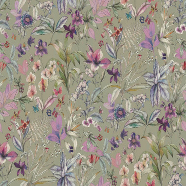 A celebration of colour and nature, this striking floral wallpaper captures the essence of a wild garden in full bloom. Hand-drawn botanicals intertwine with painterly precision, showcasing a mix of delicate blossoms, lush foliage, and fluttering butterflies. The vibrant tones of violet, blush, and green are balanced against a soft sage background, creating an elegant harmony of depth and freshness.