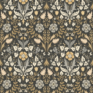 A carefully ochestrated display of florals and trailing leaves, presented in a contemporary ogee curve are the focal point of 86339412 Archibald wallpaper from the Arts & Crafts collection by Casadeco. Bursting with life Archibald wallpaper is typical of the Arts & Crafts movement made famous by William Morris in the late 19th century, certain to add a traditional style to the home that will stand the tests of time. Shown here in Noir and Camel.