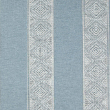 03096-06 Taya Papiers Peints Vol 7 Wallpaper by Manuel Canovas takes inspiration from the fabric Taya and features a two-tone stripe wallpaper design featuring decorative geometric detailing on alternate stripes, shown here in Ciel.