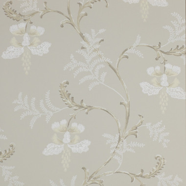 07127/04 Bellflower Lindon Wallpaper By Colefax and Fowler features an elegantly stylized design that combines pendulous flowers and arching scrolls to create a graceful and stylish wallpaper, shown here in Silver.