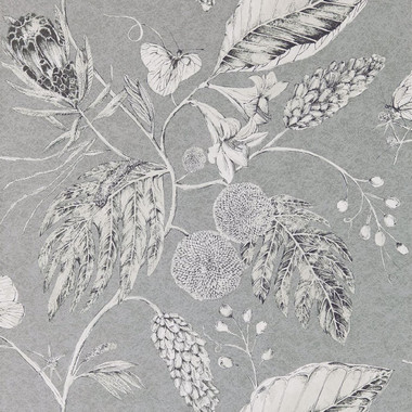 Harlequin Palmetto 111223 Amborella wallpaper a ravishing display of botanical elements. Set in a textured and metallic background in hue of Steel.