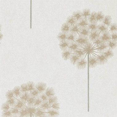 111886 Amity Paloma Wallpaper By Harlequin features a large scale dandelion design printed in a chalky white and set against a textural ground with a metallic sheen, shown here in Linen and Chalk.