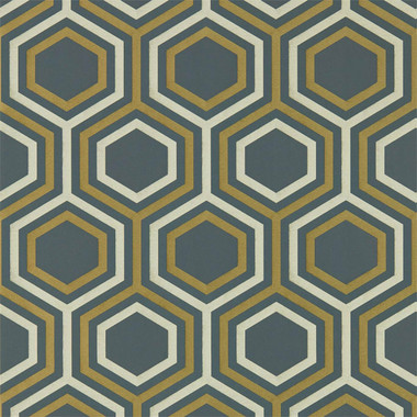 HSAW 112149 Selo Salinas Wallpaper By Harlequin features a traditional honeycomb style geometric. Brought into the modern day through the use of contemporary styling. Finished using metallic highlights and tones to add a sophisticated style which will shine effortlessly in the light. Shown here in Ebony and Gold.