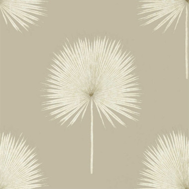 DGLW 216637 Fan Palm Glasshouse Wallpaper By Sanderson is a versatile botanical print featuring a palm leaf silhouette, formed with fine line work which adds a soft textured look and finished in metallic inks to add extra opulence and enhancement to the design, shown here in Linen and Gilver.