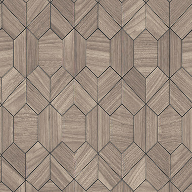 42030 Hive Ligna Wallpaper by Arte features a geometrical honeycomb that consists of inserts with a wood structure on a ground of shiny film. The film appears in fine lines between the inserts, giving a hexagonal shape.