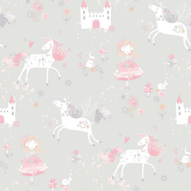 Let your childs imagination run wild with G56525 Just 4 Kids 2 Wallpaper By Galerie featuring magical unicorns, princess, castles and much more, shown here in shades of pink and white set against a grey background.