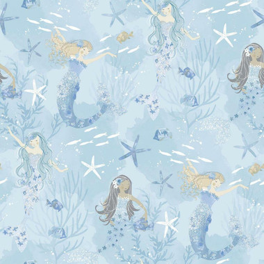 A delightful underwater scene, G78388 Mermaids wallpaper from the Tiny Tots 2 wallpaper collection by Galerie features pretty mermaids, fish, seashells and coral. Enhanced with shimmering highlights, Galerie Tiny Tots 2 Mermaid wallpaper is certain to brighten up your children's playroom or bedroom, shown here in Blue.