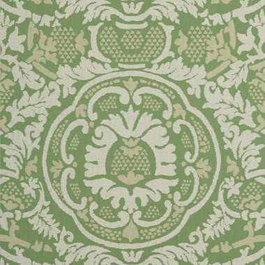 T10838 Earl Damask wallpaper from the Heritage collection captures the refined elegance of a European country manor. Featuring a stunning, large-scale medallion, this timeless design is beautifully translated into both a woven linen fabric and a coordinating screen-printed wallpaper, adding a touch of classic sophistication to any space. Shown here in Green.