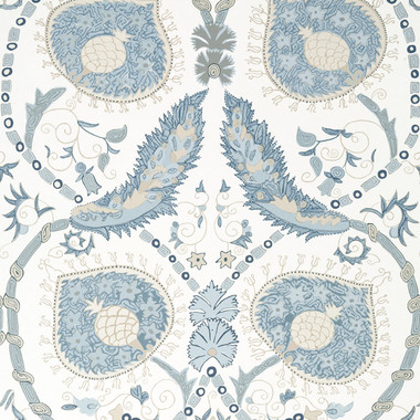 T13215 Lewis wallpaper from Thibaut's Mesa collection is a captivating design inspired by 19th-century hand-embroidered Suzani patterns. Treasured by nomadic tribes in Tajikistan, Uzbekistan, and Kazakhstan, these intricate textiles were admired for their stunning decoration and exceptional craftsmanship. This print brings a touch of cultural heritage and artisanal beauty to any space. Shown here in Blue.