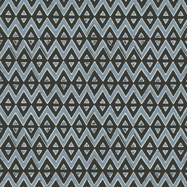 T13233 Tiburon wallpaper from Thibaut's Mesa collection features a perfectly scaled linear design that creates a hand-crafted geometric illusion. Inspired by an ancient batik textile, the pattern showcases dual-facing triangles set within diamonds, offering a timeless, artistic blend of tradition and modernity. Shown here in Black and Blue.