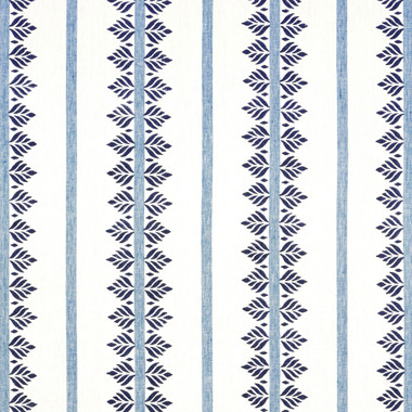Anna French Antilles Fern Stripe AF15101 Navy fabric adds rhythm and charm to interiors. Printed with stylized leaf motifs and narrow stripes. Set on plainground.