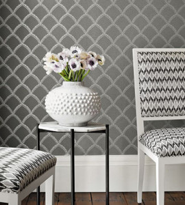 Introduce a stylish feature to any room of the interior with Burmese wallpaper from the Watermark collection by Anna French. Featuring an eastern inspired scallop shaped trellis finished in delicate dot work often seen in Oriental prints. Shown here in Metallic and Navy.
