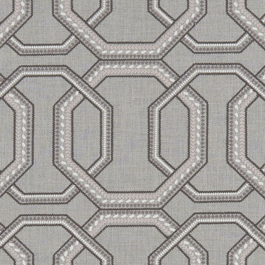 Clarke and Clarke Origins Repeat F1451-01 features embroidered medium-size geometric patterns, shown here in Charcoal.