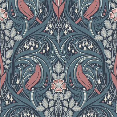 Arts and Crafts meets Art Nouveau in the iconic ET12222 Bird Scroll wallpaper from the Arts and Crafts collection by Galerie. Bird Scroll is the epitome of vintage inspired prints, depicting delicate birds perched amongst a scrolling Art Nouveau inspired damask. Shown here in Blue and Coral.