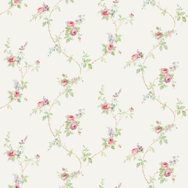 Exquisite red, pink and lilac trailing floral wallpaper, delicate shimmery green leaves against a cream background.