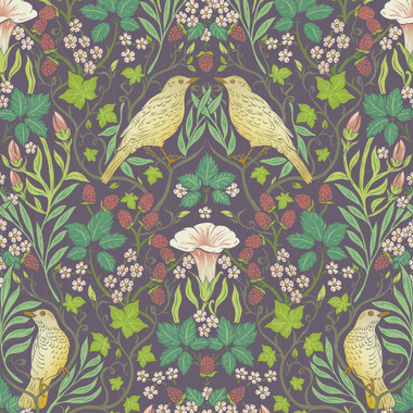 Imagine yourself in a summer vegetable garden with in the English countryside with the rustling and whistling of thrushes in the strawberry plants. This 47621 Summer Garden is a very elegant pattern with complementary colours can be combined with either painted or natural woodwork to create a dramatic yet peaceful interior appropriate to almost any room shown here in Purple Lilac.
