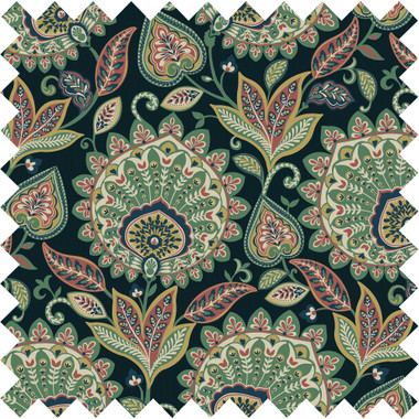This tremendously rich, striking fabric pattern combines the psychedelic art of the Flower Power era with its origins in oriental imagery such as paisley style patterns, which is found here in flamboyantly detailed symbols and elements. Forms borrowed from nature, such as stylised blossoms and leafy vines, culminate in round ornaments reminiscent of ripe fruit cut in half. As in a mandala, the eye gets lost in the richness of shapes and colours. Fabric composition is 95% cotton and 5% linen and suited to home upholstery.