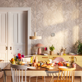 Explore the allure of this botanical wallpaper, showcasing a gentle blend of fern and palm designs complemented by fine metallic highlights against a soft, textured background. Perfect for creating a warm and inviting atmosphere.