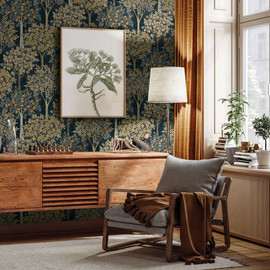 Grove wallpaper from the Mulberry Tree collection by Galerie is an enchanted forest created by blockwork on a solid, saturated background. In addition to the fascinating atmosphere Grove exudes, the main focus of this pattern is on the comforting rhythm of the different shapes of the fruits and flowers, leaves and branches. A wallpaper for forest lovers that brings the magic of this wild habitat to life