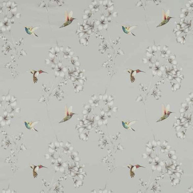 Harlequin Colour Amazilia HTEF120981 Indigo fabric features graceful hummingbirds and hand drawn flowing botanical. Fused with cotton and soft hues.
