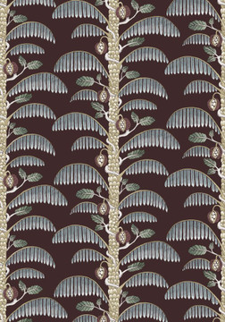 The JMW-101301 Palm Grove wallpaper from Josephine Munsey’s Portfolio 1 collection features a lush, playful design of densely packed palm trees. The artwork, rendered in watercolor, showcases a charming and naive aesthetic. Shown here in Dusk and Verdigris.