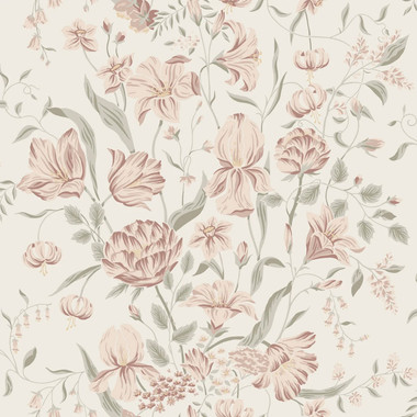 Karin and Carl shared a mutual interest in flowers, and this has been the inspiration for the Karins wallpaper from the Huset i Solen wallpaper collection by Sandberg. Karin enjoyed growing flowers, which in turn inspired Carl to paint, and all the flowers in Carl's paintings are those Karin has arranged. S10164 Karins wallpaper features an abundance of stylised flowers with a hand painted quality. Shown here in Powder Pink.