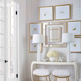T41006 Land Bridge wallpaper from Thibaut's Modern Resource 4 collection features elegant chevron patterns created by alternating line work, available in either metallic or white prints. Its natural paper string backing introduces a subtle texture, enhancing visual interest by intersecting and disrupting the patterned design. Shown here in Taupe.