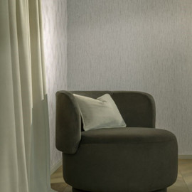 W0205/02 Asper wallpaper from Clarke & Clarke's Expressions collection features a unique string emboss that enhances its flecked, textured design, creating a delicate vertical slub effect. Its rich colour tones add a refined depth to the design, making Asper a sophisticated yet understated choice for elegant interiors. Shown here in Midnight.