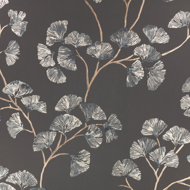 The distinctive fan-shaped ginkgo leaf graces the elegant surface of W467/01 Kiana wallpaper, offering a delicate flow and subtle tonal transitions. Inspired by an original hand-painted design, the wallpaper brings a sense of refined luxury, with shimmering metallic accents enhancing its sophisticated range of neutral shades. Shown here in Ebony.