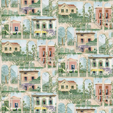 Add a rustic charm to the interior with W7813-01 Villa Como wallpaper from the Rhapsody collection by Osborne and Little. Depicting a repeating scene of traditional villas often seen on the lakesides of Northern Italy. Encompassed by stone colonnades adorned with foliage and wisteria, Villa Como is set against a hillside backdrop to add to the authenticity of the design. Shown here in Terracotta.