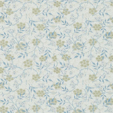 Designed in 1872 by William Morris, 214724 Jasmine Archive III Wallpaper features a beautiful design of hawthorn leaves and blossom overlaid with a meandering trail of jasmine adding a feminine touch to this charming design, shown here in Ecru and Woad.