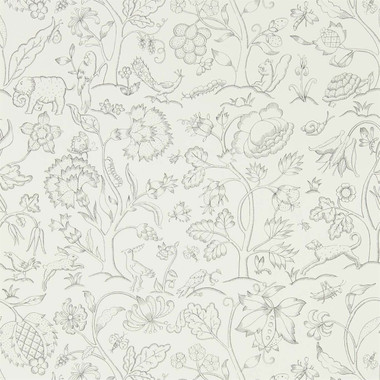 DMSW 216693 Middlemore Melsetter Wallpaper By Morris & Co takes inspiration from the characters on a quilt embroidered by May Morris and features finely drawn interpretations of animals juxtapose in a fantastical way, bringing a playful charm to all creatures great and small and is shown here in Chalk Charcoal.