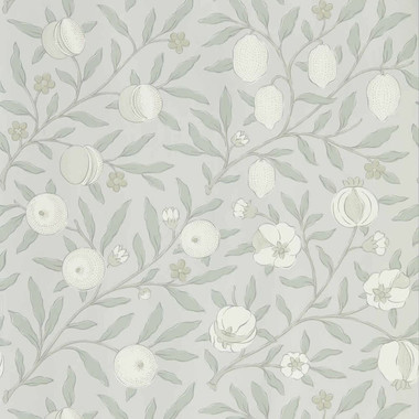 216540 Pure Fruit Pure Morris North Wallpaper By Morris & Co is one of the most well loved designs from William Morris, the original document dating back to 1864. Pure Fruit has been carefully reworked, simplifying the design elements to give a beautiful opaque and chalky quality, shown here in Grey Blue.