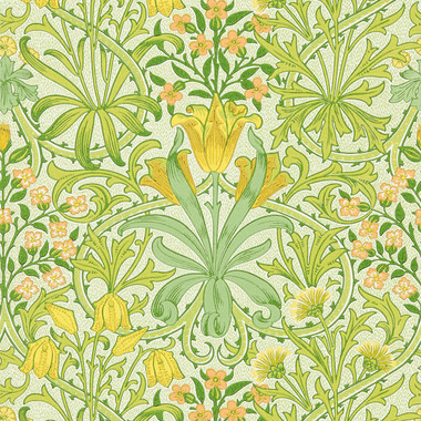 Woodland Weeds is an archive document, first printed in 1905 and attributed to John Henry Dearle. The Woodland Weeds wallpaper is unusually symmetrical and perpendicular for a Morris & Co design and features a variety of small flowers and plants. Ben Pentreath notes Woodland Weeds wallpaper as one of his favourites and has been reimagined for the Cornubia collection in a vibrant colour palette, 217100 is shown here in Sap Green.